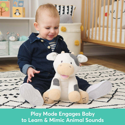 This adorable animated plush cow features soft, huggable spotted cream-colored fur with floppy arms and ears that wiggle gently during play. Babies will love singing along with their companion to Old MacDonald Had a Farm in song mode and learning about different farm animal sounds in play mode, encouraging their sensory development. Each cow plush requires 3 AA batteries, which are included for fun right out of the box. Surface washable.