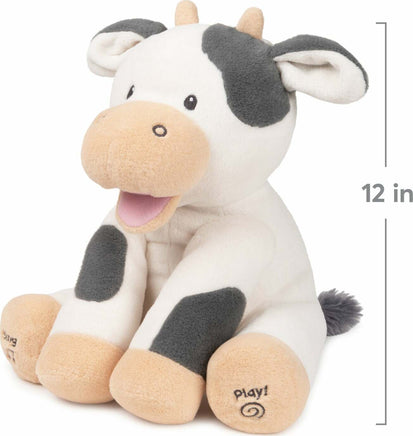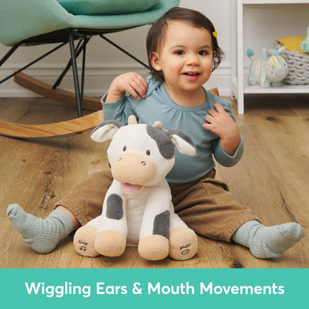 Buttermilk is the latest addition to GUNDS' family of Baby GUND® animated plush friends, elevating playtime with new songs and interactive games! Press Buttermilk's left foot to engage her in a fun, interactive animal-sound guessing game while her mouth moves in time with the lyrics. Press her right hoof to sing along to "Old MacDonald Had a Farm" in a cute child's voice while her ears wiggle to the rhythm! This impressive plush cow even has over 20 whimsical interactive phrases in Play Mode, providing exciting and unique experience each time for little ones play!