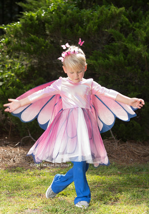 When your little dreamer steps into this beautifully designed dress, they'll magically transform into a butterfly fairy princess! The dress has a shimmery pink top and a butterfly-wing-patterned skirt with sheer pink layer. Sheer butterfly wings attached to the back make it fun to twirl, run, and jump in this dress! The included headband features butterflies that dance and flutter with every move.