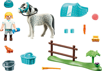 - Figures: 1 child; Animals: 1 pony, 1 bird; Accessories: 1 fence, 1 bucket, 1 basket,1 sponge, 1 curry comb, 1 riding crop, 2 gaiters, 1 saddle blanket, 1 spray bottle, 1 carrot, 1 tuft of grass