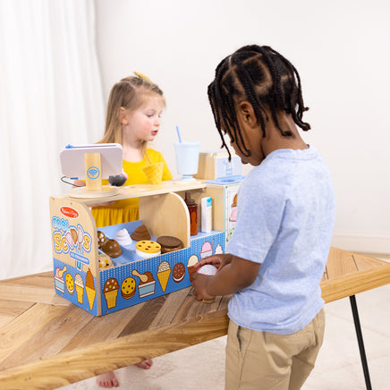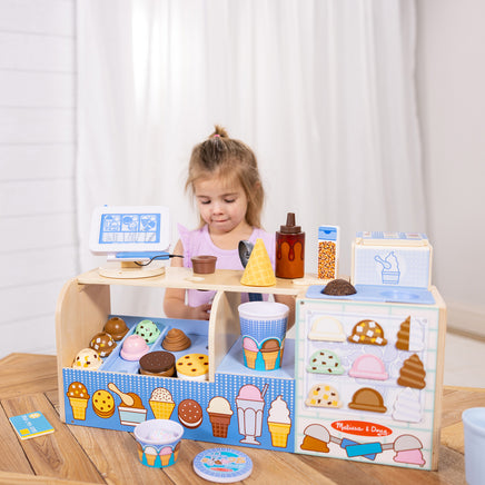 I scream, you scream, we all scream for ICE CREAM! Kids love taking food orders with this 42-piece ice creamery set. It's a clever way to teach color matching, pattern recognition, and build memory skills! The impressive wooden counter is intuitively designed for kids to pretend swiping credit cards on the swiveling order pad, snap up scoops and stack them in cones, hand over pints and cookie sandwiches, and even add toppings to soft serve flavors. Super cool for year-round role playing!