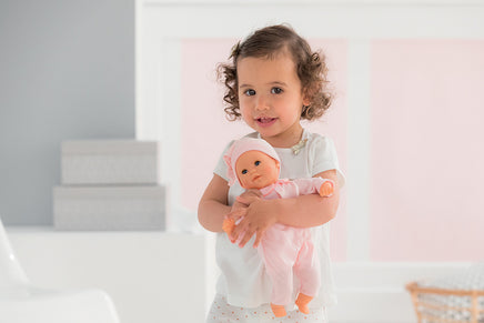 Care for baby! This sweetie with perfectly pink pajamas and bonnet is the ideal first doll. At 12 inches, she's the perfect size for tender loving cuddles, and her realistic features will melt your heart, from her touchably soft, vanilla-scented skin to her sleepy eyes that close when she lays back sleeping. If she makes a fuss, no worries! Just give her the pacifier.