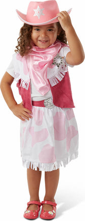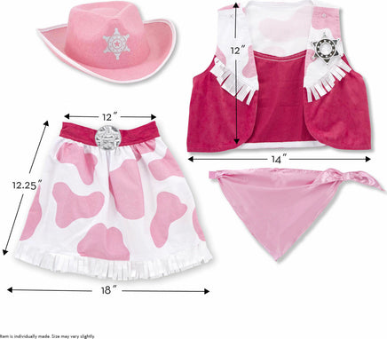 Cowgirl dress-up? Yeehaw! With this costume's pink-and-white cow-print skirt, pink satin neckscarf, pink hat and a removable sherriff's badge, we reckon your young cowgirl is in for some wild-west adventures! This exciting role-play set, sized for children ages 3-6, will inspire limitless imagination and pretend-play fun.