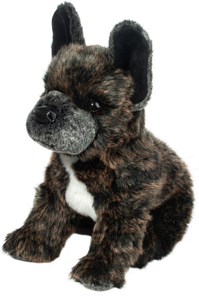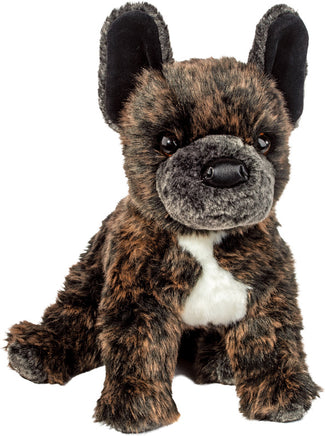 Meet every kid's best friend! This 16-inch tall, Frenchie is cuddly soft with an under-stuffed fill and a silky brindled coat. Adding to his charm and breed-specific appearance are his rounded ears and short muzzle, along with a soft, leatherette nose and amber eyes that will melt your heart.