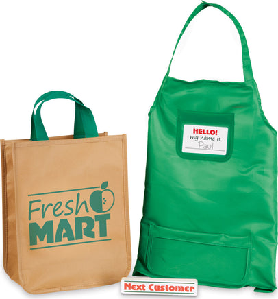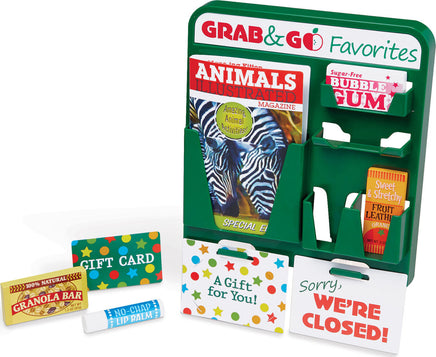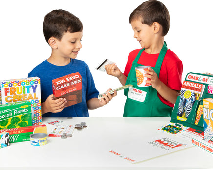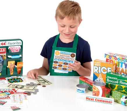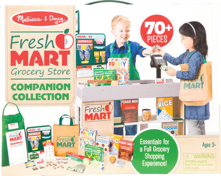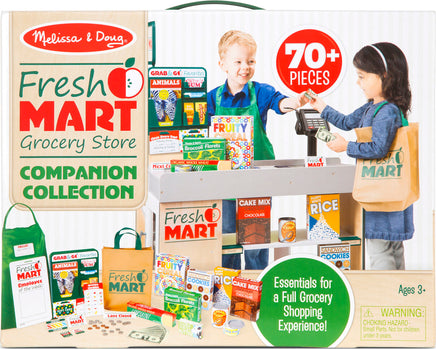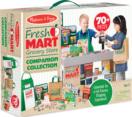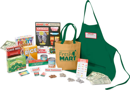 This companion set to the Fresh Mart Grocery Store has everything kids three and older need to stock shelves and get shopping! There are 70 pieces to play with, including grocer and shopper role-play items like an apron, conveyor belt divider bar, and a cloth shopping bag, a fully stocked grab-and-go rack (gum, granola bar, a magazine, and more!), play money, cards, and coupons, and grocery boxes and cans! This set plays perfectly with the Melissa & Doug Fresh Mart Grocery Store!