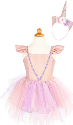 Look and feel as magical as a unicorn in our Shimmer Unicorn Dress & Headband set. This set features a soft pink dress with ruffled cap sleeves, purple detailing and a flouncy tulle skirt, and a floral unicorn headband.
