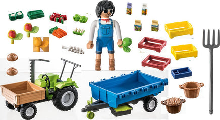 Figures: 1 man; Accessories: 1 tractor with trailer, 4 tetra packs, 3 apples, 2 salads, 1 pepper, 1 cucumber, 5 transport boxes, 1 pitchfork, 2 cauliflower, 2 loaves of bread, 1 egg, 1 garlic, 1 carrot, 1 pasture basket, 1 potato basket