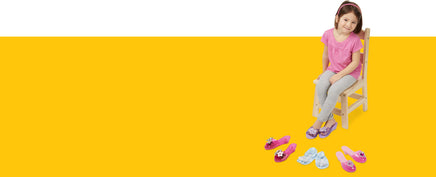 Four pairs of play shoes in one stylish set! These high-quality dress-up shoes are made to fit comfortably, look great, and last for years. With four exciting styles--Elegant Princess, Prima Ballerina, Magical Fairy, and Rocker Girl--kicking off a pretend-play adventure is as easy as putting on a pair of pretty shoes! Wear them confidently for playtime--the rubber soles resist slips and the durable construction will stand up to adventure after glamorous adventure. Fits ages 3-5. Coordinates with Melissa & Doug's Goodie Tutus dress-up skirt collection and Crown Jewels dress-up tiara collections.