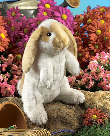 New to the bunny hutch is the Folkmanis Standing Lop Rabbit puppet featuring distinctive long ears and cashmere-soft fur in a creamy white and "broken" brown color pattern.