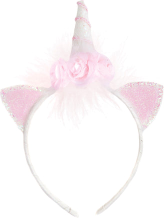Pretend to be a unicorn for the day! This fun pink and white unicorn headband is just what you need to complete any unicorn look. Sparkly glitter pink ears, soft marabou trim and pink roses attach to a magical unicorn horn with pink sequin details.