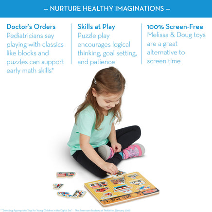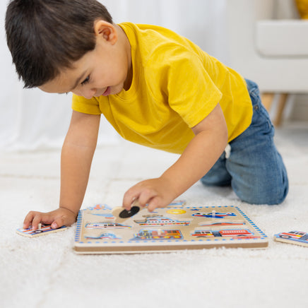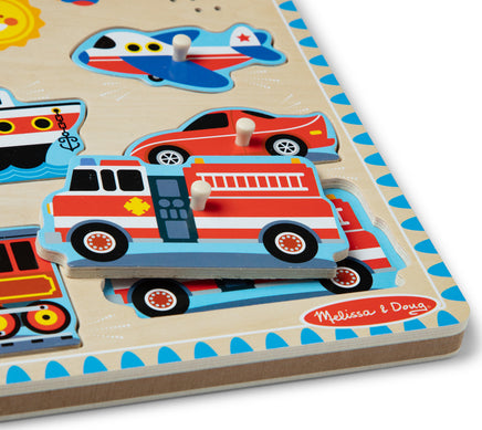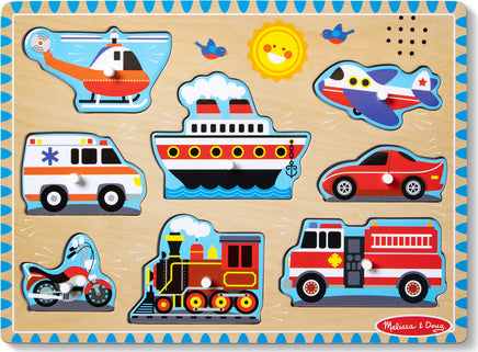 Place a vehicle puzzle piece correctly in the puzzle board and listen to it toot, beep or rumble! Eight great sounds and a full-color, matching picture beneath the eight wooden pieces.