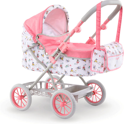 Help little ones take care of their baby doll the way you take care of them! Make-believe moms and dads will love taking their favorite baby doll for a stroll in style in this durable carriage. In pink, white, and grey tones, it features a pattern of adorable animals doing everyday tasks. The handle height is adjustable from 14" to 29.5" to accommodate children as they grow. It has an adjustable hood, a storage basket for baby's things, a removable bassinet cover and comes complete with a matching nursery bag. When playtime is over, the carriage folds easily for space-efficient storage. Fits dolls up to 20".