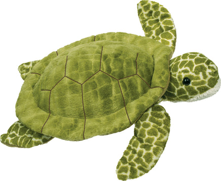 Capable of migrating distances of thousands of miles, nobody knows the ocean's waters better than Pebbles! Our sweet Green Sea Turtle stuffed animal has been crafted with soft plush materials that feature realistic patterns and textures. High quality fill within ensures she'll bounce back after every affectionate squeeze, while floppy flippers will endear her to turtle fans everywhere. Her expressive, dark eyes are sure to engage on an emotional level and will promote creative play. So put on your scuba gear and follow the ocean currents with Pebbles the plush Sea Turtle. She'll take you to new depths and inspire an appreciation of our deep blue seas!