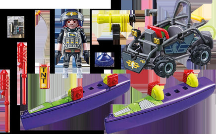 • The 59-piece police toy includes a transformable quad with attachable cannon, dynamite, special forces equipment and a PLAYMOBIL figure.