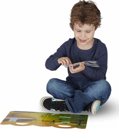 These reusable puffy stickers let kids create dinosaur adventures again and again! Tell countless stories with these fun dimensional stickers and scenes. Just place and layer the dinosaur puffy stickers onto the double-sided background board of the sunrise waterfall and mid-day watering hole scenes. Ready for a story change? It's easy to lift, switch, layer, and rearrange it all to depict whatever prehistoric tale a child can imagine! The built-in sticker collection--36 reusable puffy stickers in all--offers endless opportunities for kids to express their creativity and have lots of pretend-play fun, all while improving fine motor skills and communication. It's great for travel, too: The sturdy background board (with built-in handle!) folds to neatly store it all away.