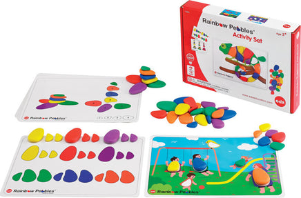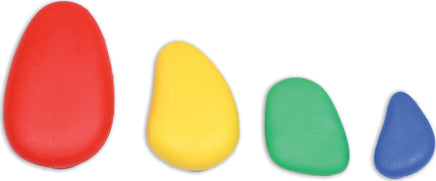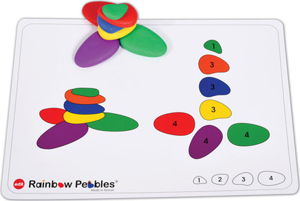 Children will have fun with this construction and early learning activity set. Ideal for developing fine motor skills and creative design. How many pebbles can you stack before they topple over? Encourage visual perception, sorting, counting, sequencing, stacking and more! The wonderful tactile experience of the smooth, rubbery pebbles in six different colors will delight the senses. Set includes 48 plastic pebbles in 4 sizes and 6 colors and 12 double-sided full-color activity cards measuring 11.63" x 8.25". Size range: 2.1"L x 1.3"W - 1.1"L x 0.75"W.