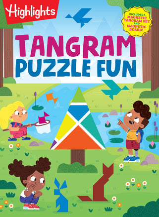Tangram Puzzle Fun includes dozens of tangram puzzles with an included magnetic board and shape pieces. Arrange the pieces to form a larger picture! Tangrams are a unique way for kids to practice concentration and critical-thinking skills through play. The magnetic board and pieces let kids solve each tangram repeatedly for endless puzzle fun.
