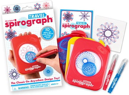 Now you can create countless amazing designs on the go with the classic Travel Spirograph! This portable Spirograph studio has a built-in design ring, work surface and storage compartment for holding your wheels, pens, paper, design guide and finished artwork. The Travel Spirograph is the perfect "go anywhere design toy"!