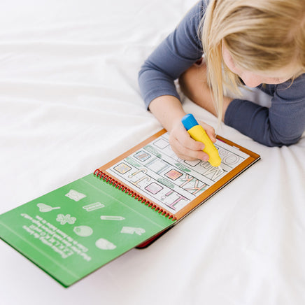 This exciting activity book includes four reusable pages and a refillable water pen. Use the pen to fill in each activity, from coloring in boxes to tracing letters, and see hidden colors and pictures appear with every stroke! Then simply let the page dry to erase the pictures and fill it in again and again. This alphabet-themed book includes every letter of the alphabet (uppercase and lowercase) to trace, alongside pictures of familiar objects to illustrate each sound. There are empty lines for practice, too! The chunky-sized water pen is easy for kids to hold and stores neatly right in the front cover.