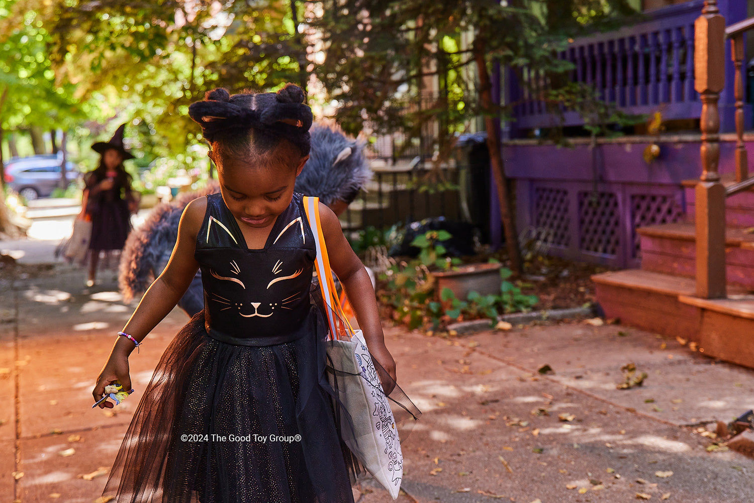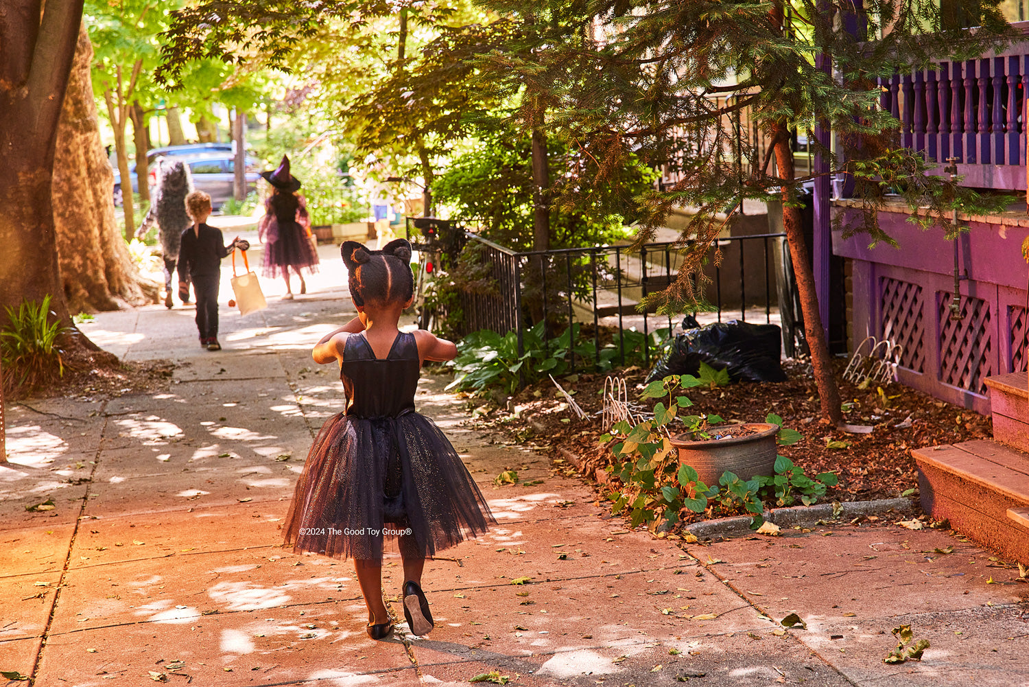 If you're on the prowl for a cat costume for your little dreamer, get your paws on this dress! The gorgeous black fabric is accented with a shiny gold cat face, and the layers of black tulle skirts have thousands of shiny gold dots that catch the light. The furry black cat ear headband is lined with gold and purr-fectly completes the outfit. Add excitement to everyday outings (like toy store trips!) dressed in style! It's beautifully crafted yet built for years of imaginative play adventures... and best of all, it's machine washable.