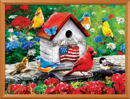 Songbirds have gathered around a quaint birdhouse nestled in a grassy meadow. Bright wildflowers are scattered among the grasses, adding their red, white, and blue hues to this cheerful scene. Sit back, relax, and enjoy this beautiful puzzle.
