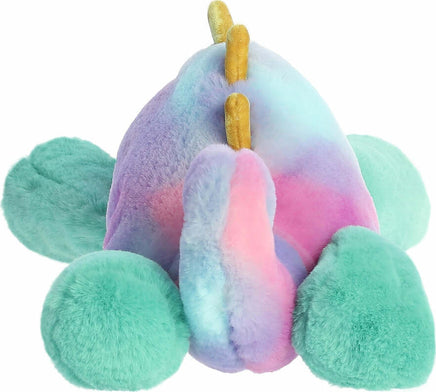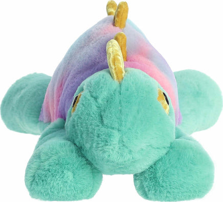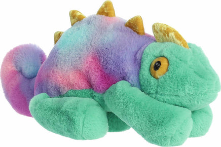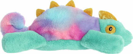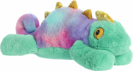 Snoozles have taken an even more magical turn! Snoozles are large plush animals with floppy body that lays flat as they get ready to have a quick snooze! These adorable plush styles are perfect as tagalong plush friends or resting in your favorite lounge spot! This Chameleon embodies the characteristics of a chameleon with blue spikes and a dark seafoam green coat that blends with sherbert toned pinks, purples, and oranges.