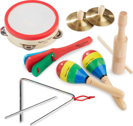 This musical set includes a tambourine, cymbals, maracas, clacker, tone blocks and a triangle. It's everything preschoolers need to form a marching band, launch a solo career or just enjoy exploring music and sounds.