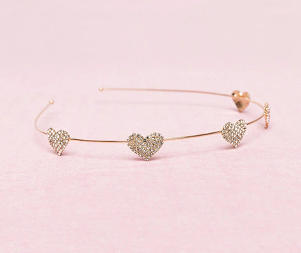 This exquisite Rhinestone Heart Headband is a dazzling accessory that effortlessly adds a touch of glamour and elegance to any ensemble. This headband is made with a thin rose gold band, accompanying 5 rhinestone encrusted hearts, adding a luxurious sparkle to your hair and framing your face with a radiant glow.