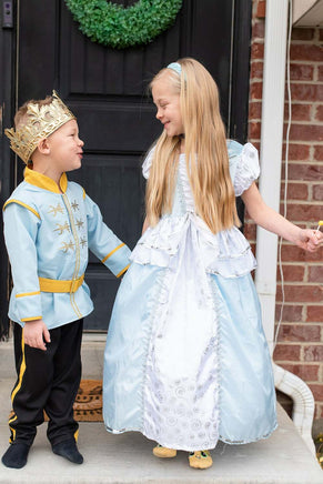 Your little one will feel like they have been transformed by a fairy godmother when they slip on our Cinderella dress! It features a stretchy blue velvet bodice that is elegantly detailed with a gathered white inlay, sparkling silver trim and adorned with a flower. The silver trimmed peplum captures that authentic Cinderella look.