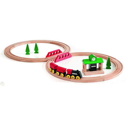 A classic starter set for the 2 year + child with all wooden details. Take the classic inspired engine out on an adventure along the tracks. Stop by at the all wooden station and continue along the tracks passing by trees and a crossing bridge. Lots of fun for the youngest drivers!