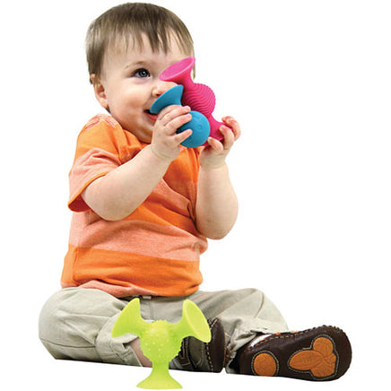 Our set of three little suckers works as a suction toy on strollers, high chairs and in the bath. Babies delight in the movement, sound and texture, encouraging exploration and sensory awareness. Made of silicone, BPA free, and dishwasher safe. For ages 6-18 mos.