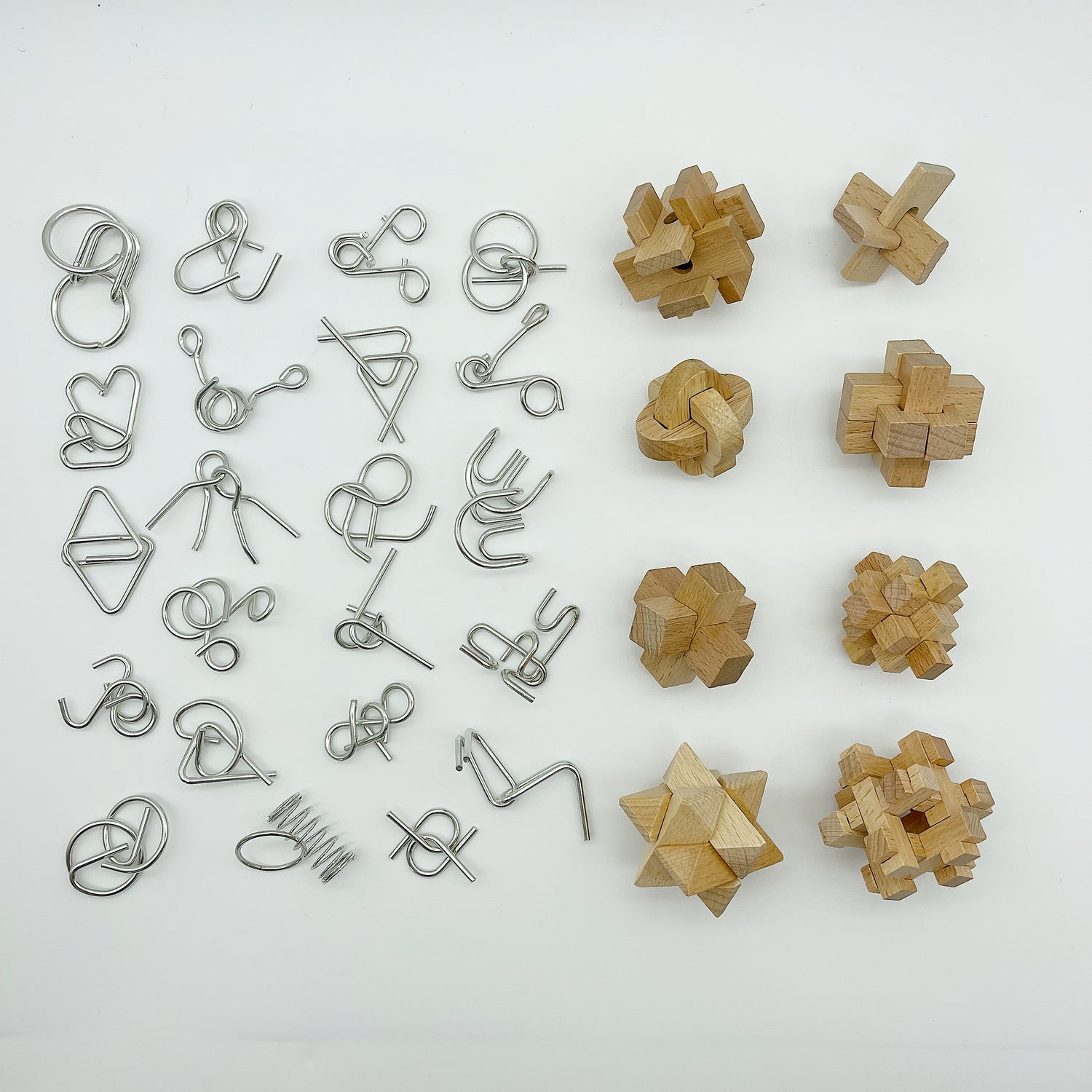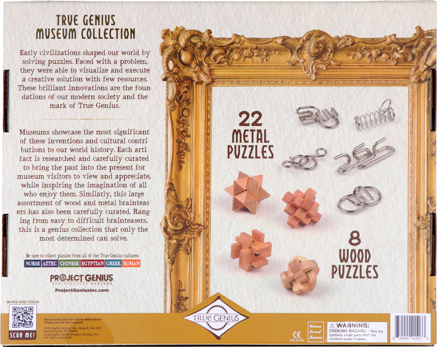 Museums showcase the most significant of these inventions and cultural contributions to Project Genius' world history. Each artifact is researcher and carefully curated to bring the past into the present for museum visitors to view and appreciate, while inspiring the imagination of all who enjoy them. Similarly, this large assortment of wood and metal brainteasers has also been carefully curated. Ranging from easy to difficult brainteasers, this is a genius collection that only the most determined can solve. Features 22 Metal Disentanglement Puzzles and 8 Wood Disassembly Puzzles.