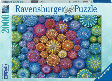 The radiant colors of the rainbow are revealed in this photographic image capturing the amazing work of Australian artist Elspeth McLean! Inspired by nature, her designs are reminiscent of sea urchins, as each stone is painstakingly painted with a multitude of precise acrylic dots in gorgeous, unique patterns. Separately, each Mandala Stone is a delicious work of art. Together, they are a sumptuous feast for the eyes, and sure to be a favorite puzzle for friends and family to enjoy!