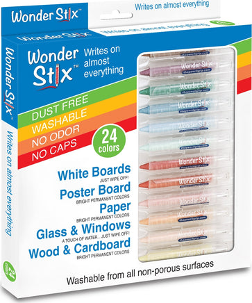 Let your imagination run wild with Wonder Stix! Wonder Stix are washable, odorless, dust free and cap free! They work on wood, cardboard, whiteboards, paper, glass and windows. Includes 24 Wonder Stix.